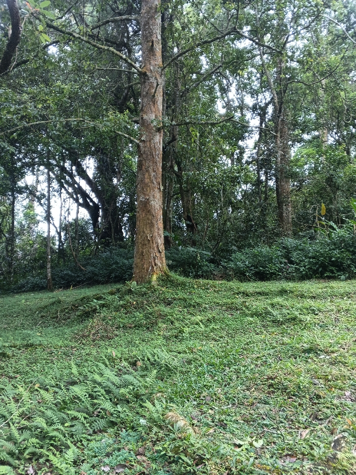 The scene depicts a natural, densely vegetated forest clearing located in Tây Ninh, Vietnam. The foreground consists of an uneven ground surface covered predominantly with green ferns and various species of grass. A prominent tree with a light brown, vertically ridged trunk is centered in the midground, its base surrounded by the ground cover. The background features a thick arrangement of trees displaying dense green foliage and visible trunks, creating a robust canopy. No human subjects, animals, man-made objects, or discernible actions/interactions are present within the frame. The ambient lighting appears diffused, consistent with an overcast sky or dense overhead tree cover.