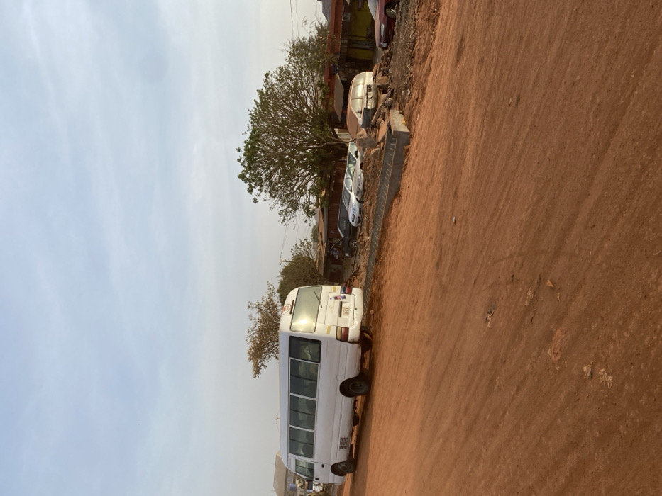 This image depicts an outdoor scene in Television, Nigeria, characterized by an unpaved, reddish-brown dirt road in the foreground and mid-ground. The sky above is a light, hazy blue with faint white cloud formations. On the left side of the frame, a white Toyota Coaster-style mini-bus is prominently positioned, facing away from the viewer and slightly towards the right, indicating it is parked or moving slowly towards the right. The rear of the bus shows sun glare reflecting off its window and bumper. A partially visible Nigerian license plate is present on the rear bumper. To the right of the road, a newly constructed or partially completed concrete gutter system runs parallel to the roadway. Beyond this gutter, a line of approximately five parked vehicles is visible on a darker, possibly unpaved area. These include a dark sedan, at least two silver sedans, and a reddish-brown sedan. Adjacent to these parked cars, debris and piles of earth are present. In the mid-ground and background, scattered trees with varying foliage density are observed, some appearing greener than others. Behind the vehicles and trees, a collection of single-story and multi-story buildings with various roofing materials, including corrugated iron, are visible, suggesting a mix of residential and commercial structures. No discernible individuals are visible within the frame performing specific actions.