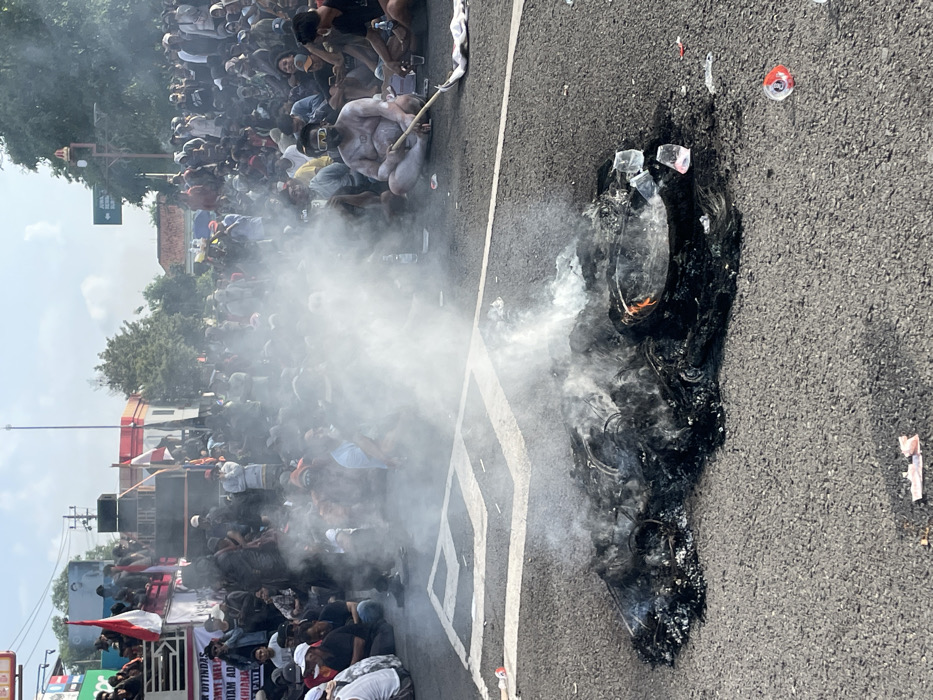 This image captures a protest occurring on an asphalt road in Pati, Indonesia, under clear daylight conditions
