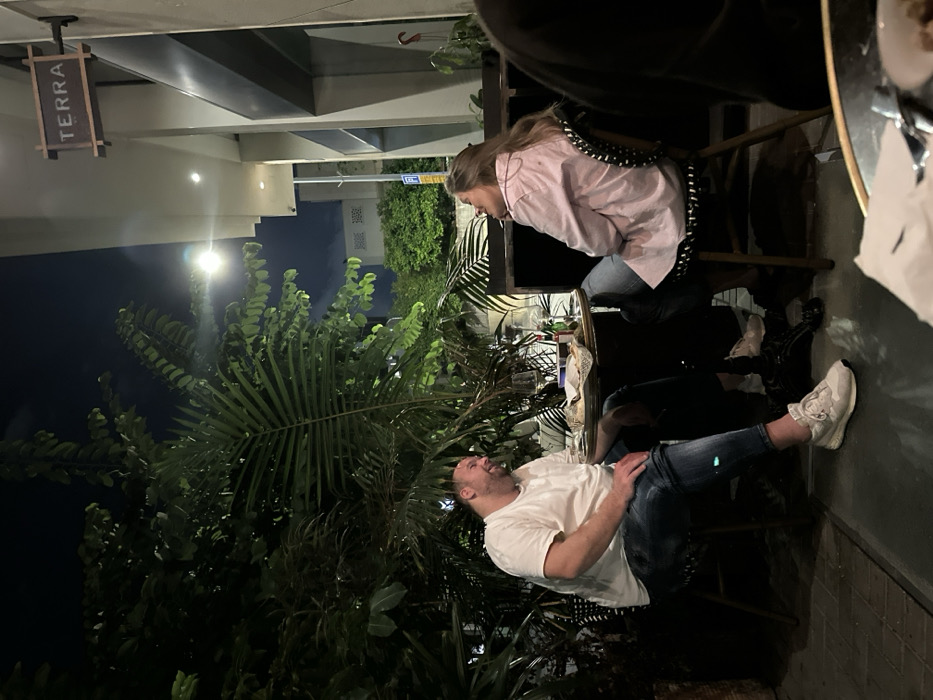 An outdoor nighttime scene depicts two individuals seated at a round table, engaged in conversation, at the Terra restaurant located in Tel Aviv, Israel