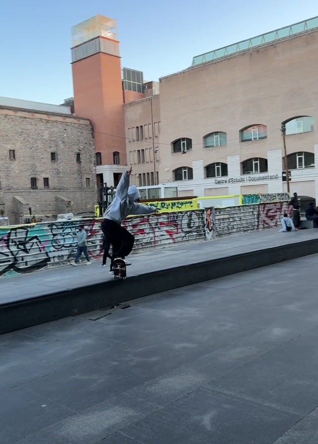 skateboarder failing to land a trick in a city plaza. The skateboarder, wearing a light gray hoodie and dark pants, attempts a trick on a raised concrete ledge but fails to land it, causing the skateboard to roll away. The plaza is paved with gray stone. Behind the ledge, there is a wall covered with graffiti, and beyond that is a group of people sitting and standing. The backdrop features buildings of different heights and architectural styles. Another skateboarder, wearing a black t-shirt and gray pants, is visible in the background, also riding a skateboard. The sky is clear and blue. A banner with the letters MAB is visible on one of the buildings.