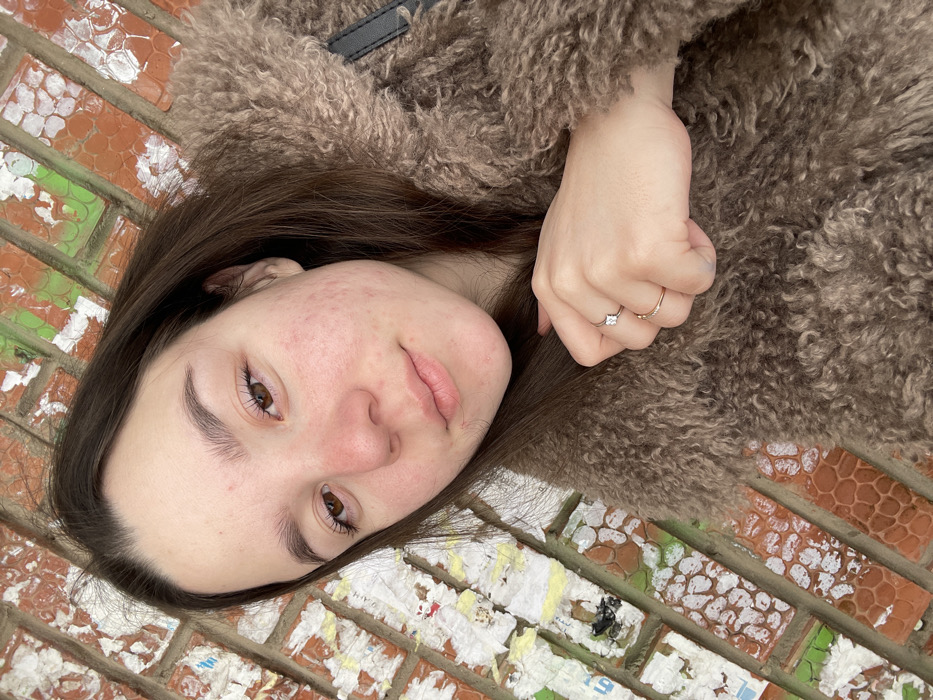 A female individual, appearing to be in her late teens or early twenties, is depicted in a close-up portrait in the city of Ольховка, Russia. She has medium brown hair, brown eyes, and fair skin with visible redness and blemishes on her cheeks. She is wearing a shaggy, brown, possibly faux-fur coat. Her right hand, adorned with a thin gold-colored band and a silver-colored ring featuring a square-cut clear stone on the ring finger, is positioned near her left shoulder, potentially grasping the coat or hair. The background consists of a red-orange brick wall, partially covered with torn white and yellow paper fragments and traces of green color. A dark strap, possibly from a bag, is visible behind her right shoulder. The subject maintains direct eye contact with the camera.