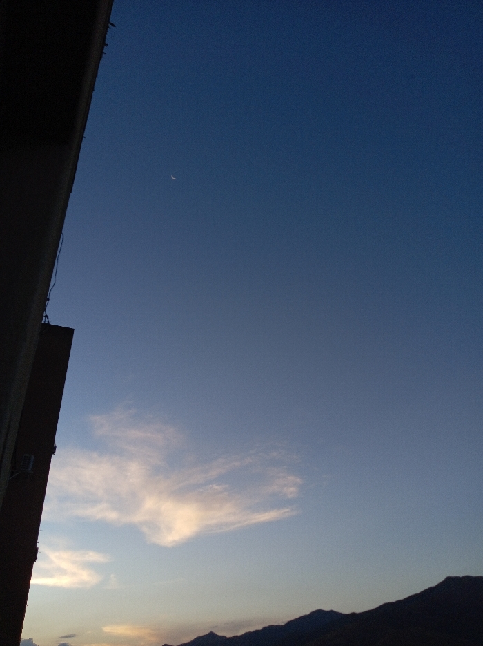 A twilight sky displays a crescent moon high above. A white, wispy cloud sits below, illuminated by the setting sun. The dark silhouette of mountains lines the horizon. A portion of a building, possibly a balcony, is visible to the left. The sky transitions from a darker blue above to a lighter hue near the horizon.