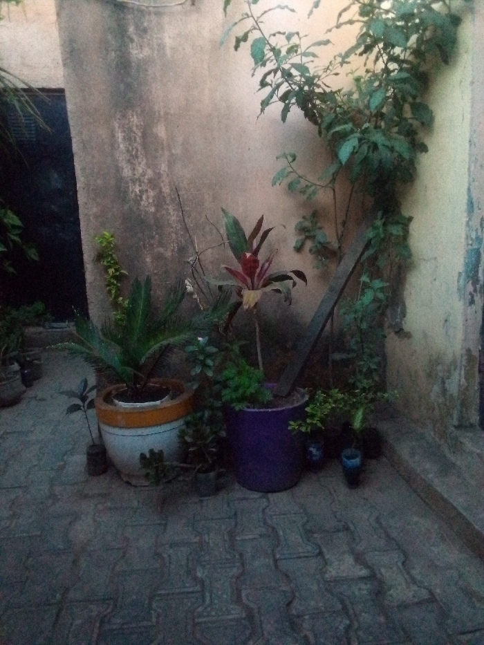 The image depicts an outdoor corner setting in Bukuru, Nigeria, characterized by low light conditions. The scene features a collection of potted plants arranged on a paved surface. Two concrete walls, meeting at an approximately 90-degree angle, form the background. The walls exhibit discoloration, staining, and wear. A dark, possibly metal, structure or doorway is partially visible on the far left. The ground is covered with grey interlocking concrete pavers forming a distinct pattern. Several plants are present: * A large plant with prominent green fronds is contained within a white pot featuring an orange rim, positioned centrally in the foreground. * Adjacent to it, to the right, a plant with reddish-green foliage stands in a purple pot. A wooden stick or plank leans against the right wall, extending into this purple pot. * Numerous smaller plants are housed in dark-colored, utilitarian pots, some appearing to be repurposed plastic containers, scattered on the paved ground around the larger potted plants. * A climbing plant with green leaves adheres to and grows upwards along the right wall. No individuals or specific actions are observed within the frame.