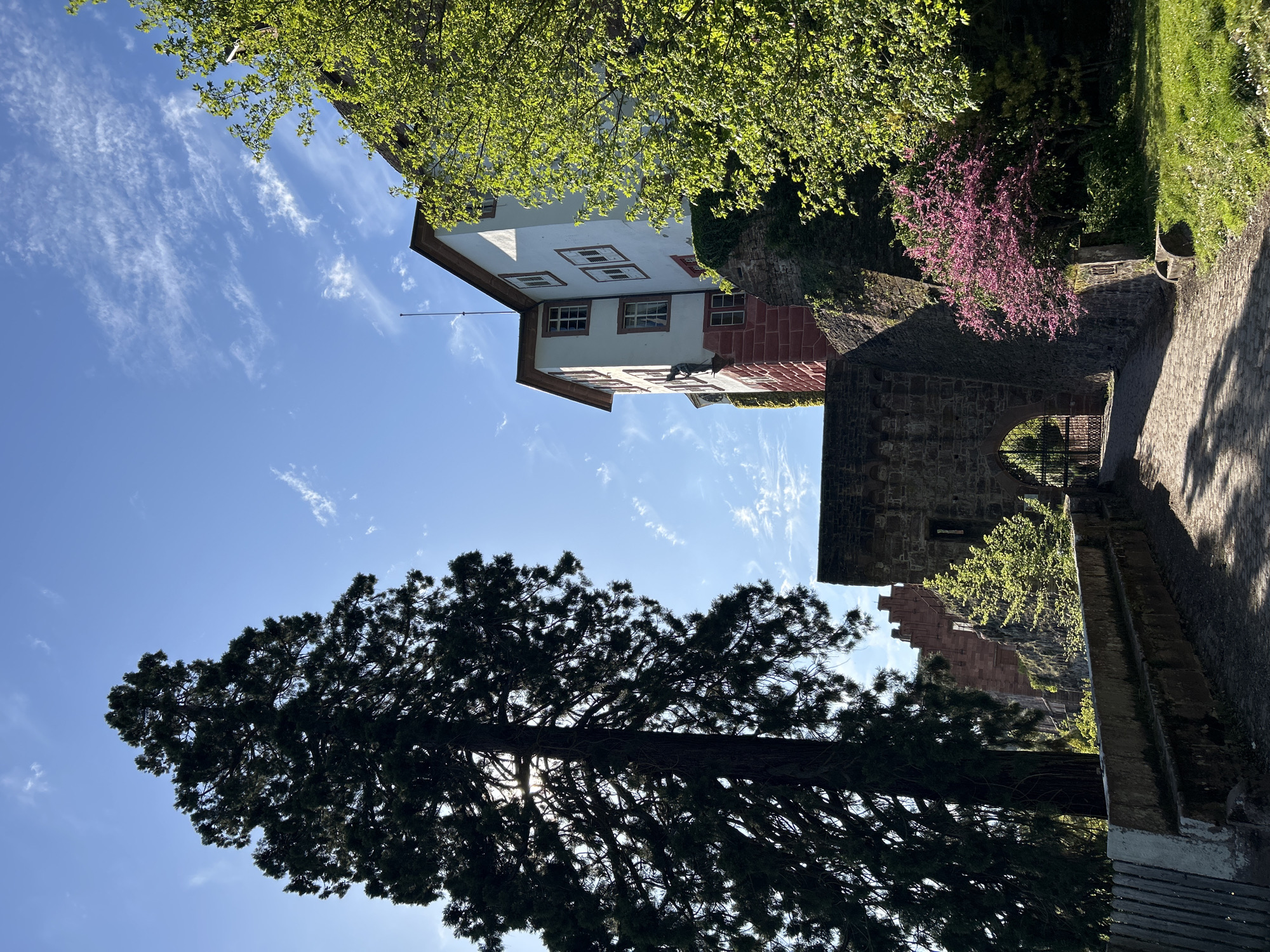 view from a low angle towards a tall building with white walls and red-framed windows, situated in the city of Unknown, Unknown. The sky is blue with streaks of clouds. A large tree occupies the lower portion of the frame, obscuring part of the building. A stone wall with an archway is visible to the right of the building, with greenery visible behind it. A pink-flowered tree grows near the stone wall. A paved pathway is present on the right side of the frame, running alongside a low wall.