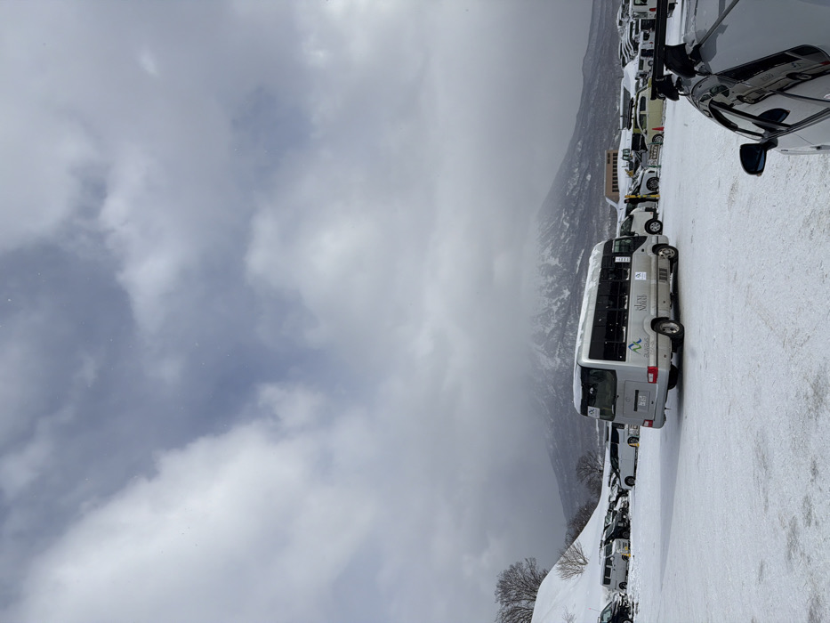 A winter scene captures a parking lot covered in snow, filled with various vehicles, including a prominent white bus in the foreground. In the background, a hazy mountain partially obscured by clouds looms. The sky is overcast, adding to the winter atmosphere. The vehicles appear lined up neatly on the snow-covered ground, suggesting an organized parking arrangement despite the wintry conditions.