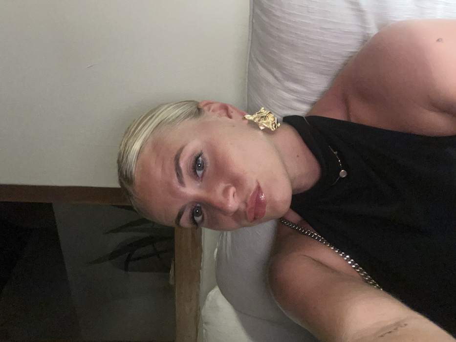 An adult female with light-toned skin is depicted seated indoors on a light-colored, ribbed sofa in Pecatu, Indonesia, at night. She has blonde hair pulled back and is making a slight 'pout' expression with glossy lips, looking directly at the camera. She wears a black halter-neck top, a single prominent gold-toned, abstract-form earring on her right ear (viewer's left), and a thin necklace with a small circular pendant. A silver-toned curb chain strap, likely from a bag, rests over her left shoulder (viewer's right). A small dark mark is visible on her right shoulder (viewer's left), and a faint linear mark is present on her left forearm (viewer's right). Behind her, to the left, a dark window with a visible wooden frame reveals the silhouette of a tall plant against a dark exterior. The upper right background consists of a plain light-colored wall. The scene is illuminated by an unseen artificial light source, casting soft light on her face.