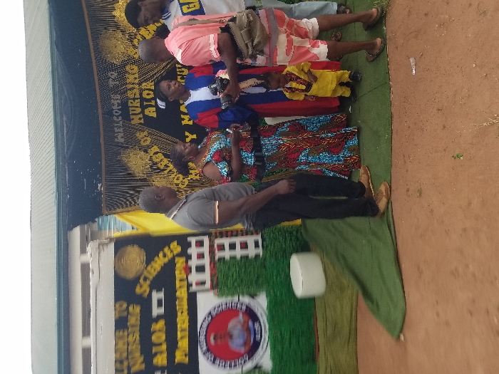 The image depicts an outdoor gathering, likely a matriculation ceremony, at the College of Nursing Sciences in Alor, Nigeria