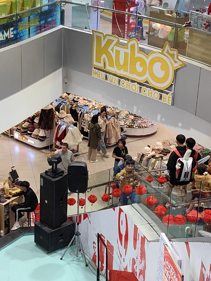 This image depicts the interior of a multi-level shopping mall in Da Lat, Vietnam. The scene is observed from an elevated viewpoint, looking down into a lower retail and event area. In the mid-ground, a prominent yellow sign displaying "Kubo" and "KHU VUI CHƠI CHO BÉ" (Children's Play Area) is affixed to a grey wall. Below this sign, a retail section features racks of clothing, including coats and jackets, and circular displays filled with various hats and footwear. Two women are observed standing near a clothing rack, one in a green jacket and the other in a light-colored top, appearing to browse merchandise. A third woman in a dark shirt stands further back. A partial "NINA" sign is visible on one display stand. In the foreground and lower section of the image, a light blue-colored floor area is visible, adjacent to an informal event setup. This setup includes two large black speakers stacked vertically, topped with a stage light fixture, and an additional black speaker on a tripod stand. To the left, a vendor in a black tracksuit and cap is seated at a small wooden counter, operating a waffle maker and other food preparation equipment. A glass-paneled stair railing descends through the lower right quadrant. Numerous red paper lanterns are suspended from this railing. A young boy in a brown puffer jacket is visible on the stairs, holding the railing, with another individual carrying a white backpack positioned behind him on the same staircase. A large white wall with red graphic designs is partially visible behind the stair railing.
