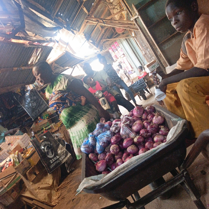 This image depicts a market stall in Shendam, Nigeria. In the foreground, a dark wheelbarrow, lined with a plastic sheet, is filled with numerous red onions, some contained within blue plastic bags. To the right, a young male, appearing to be a teenager, with dark skin, wears a light orange shirt and yellow trousers, sitting with his left arm resting on the wheelbarrow. He holds a white, fluted object, possibly an LED bulb, in his right hand, looking left out of frame. To the left, a woman with dark skin, wearing a green, white, and blue patterned garment, is bent over an unseen surface, facing right. A small child is visible on her back, secured by fabric. Behind her, shelves or stacked boxes display various merchandise, including black shopping bags with "ZAMA SHOPPING BAGS" and "STARICH" branding. In the midground, other individuals are visible. One person in a red shirt sits on a red scooter or small motorcycle. Another individual stands nearby. The market stall features a corrugated metal roof supported by wooden beams, with evident gaps and wear in the structure. Natural light illuminates the scene, suggesting an open-air or partially covered environment. The ground appears to be uneven earth.