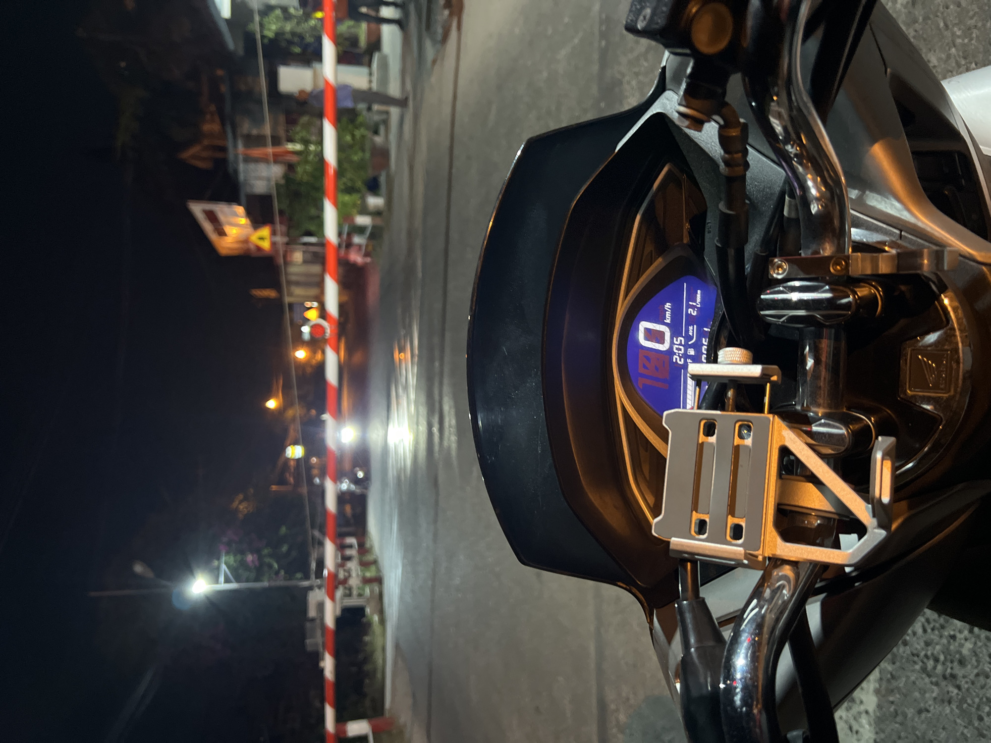 handlebars and instrument panel of a motorcycle at a train crossing at night. The instrument panel is illuminated and displays a speed of 0 km/h and a time of 2:05. A metal phone holder is attached to the handlebars. The train crossing has red and white striped barriers. Streetlights and traffic signs are visible in the background. The street is wet.
