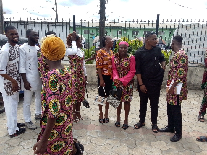 group of people standing outside on a paved sidewalk in front of a black metal fence. The scene is set in Yenagoa, Nigeria at the coordinates 4.931 latitude and 6.267 longitude. There are seven people in the photo, all of whom are adults. Four are wearing clothing with patterned designs. The two in the front, one with a yellow hat and the other with a black shirt, are facing forward. They are both holding a bag. In the back, a woman in a pink shirt is speaking with a man in a black shirt. The other individuals appear to be listening to them. The people are standing on a pavement made of hexagonal blocks and behind the fence is a building with a green wall.