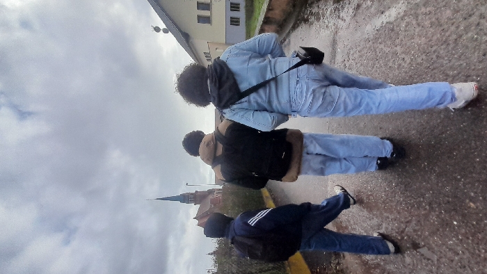 Three individuals are depicted walking away from the camera along a wet, dark-surfaced pathway in Meistratzheim, France, under an overcast sky. The leftmost individual wears a dark blue hooded jacket with three white stripes on the upper left arm, blue pants, and white and black athletic shoes. A black backpack is worn. The middle individual wears a tan or light brown hooded jacket, light blue pants, and dark shoes, also carrying a dark backpack. The rightmost individual, exhibiting dark curly hair, wears a light blue denim jacket over a dark hooded garment, light blue denim jeans, and white sneakers, carrying a small black bag with a strap across the body. In the background, to the left of the pathway, stands a red brick church with a prominent, slender dark steeple, identifiable as St. Martin's Church in Meistratzheim. Green foliage lines the path on the left. To the right of the path, a light-colored building with multiple dark-framed windows is visible, featuring a roof-mounted antenna structure. A low, light-colored concrete or stone wall runs parallel to the path on the right. The sky is uniformly grey with dense cloud cover. The ground surface is dark and reflective, indicating recent wetness.