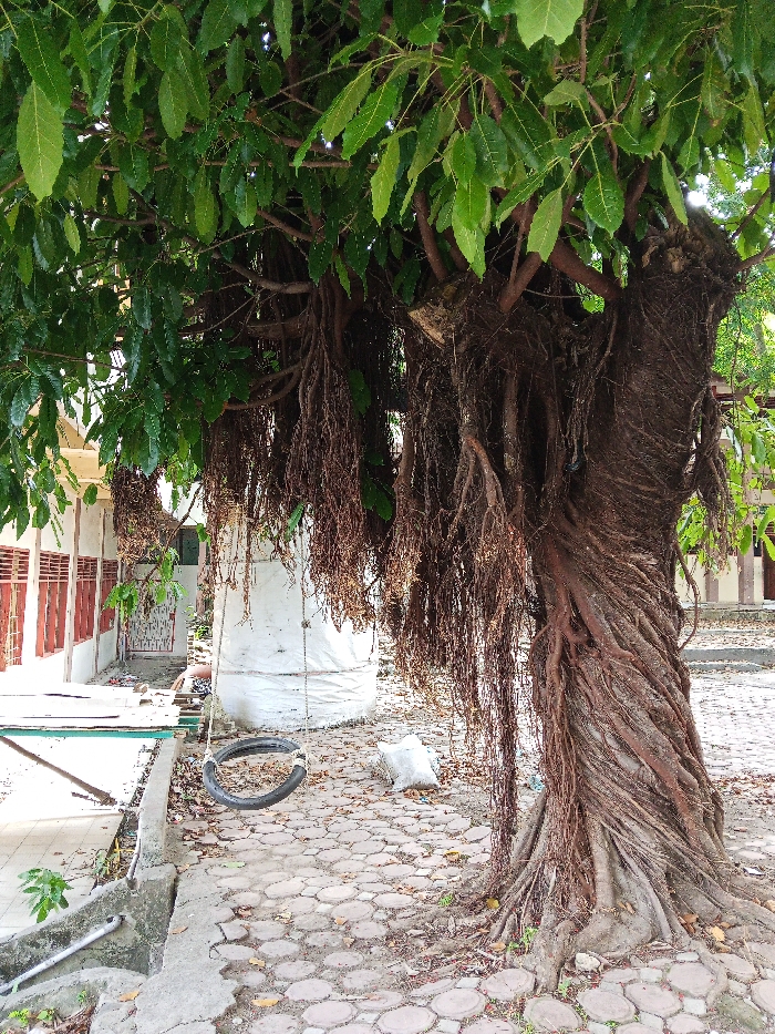 The scene depicts an outdoor courtyard or open area in Unknown, Unknown, dominated by a large, mature tree with a thick, deeply gnarled and spiraling trunk. Numerous thin, brown aerial roots hang extensively from the tree's branches and upper trunk, extending towards the ground. The tree possesses a dense canopy of vibrant green leaves. The ground beneath the tree and extending into the foreground is paved with interlocking light-colored hexagonal or octagonal concrete pavers, upon which scattered dry leaves and small debris are visible. A black rubber tire, serving as a swing, is suspended by ropes or chains from a sturdy lower branch or aerial root of the tree, hanging over the paved surface. To the left of the image, a single-story building with a light-colored (possibly off-white or light yellow) facade is visible. It features several horizontally oriented windows with reddish-brown frames or shutters. A concrete ledge runs along the base of the building, and a section of a light green tiled or painted surface is on the ground closer to the structure. A gray pipe is also visible near the base of the concrete ledge. In the mid-ground, behind the tire swing, a large, upright white woven bag (possibly a bulk bag) is situated. A smaller, crumpled white bag lies on the paved ground to the right of the swing, near the base of the tree. No individuals, actions, or direct interactions are observable within the depicted scene. The area is illuminated by bright daylight.