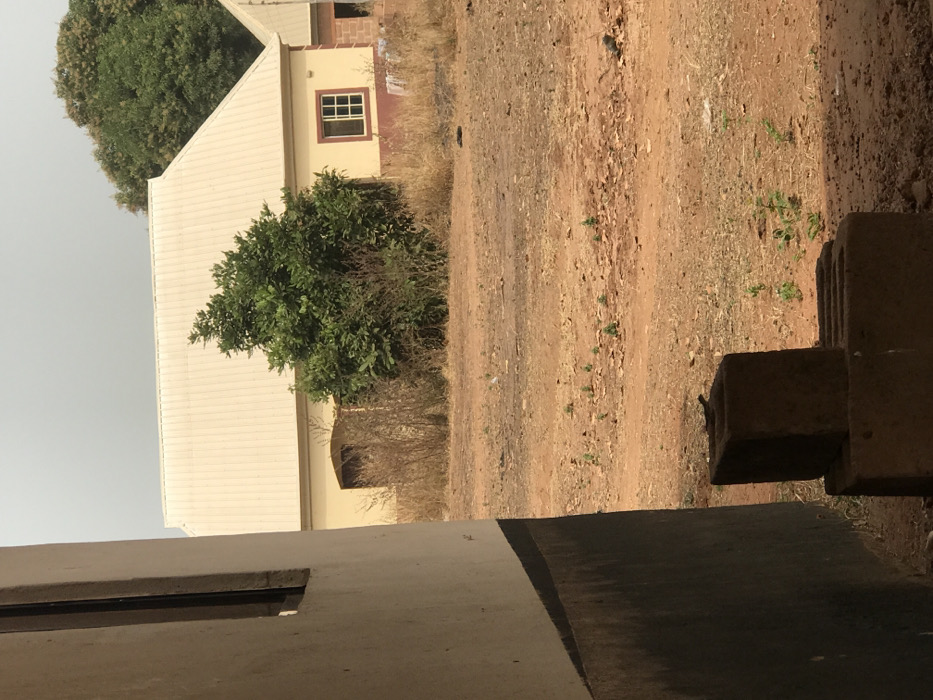 The image depicts an outdoor scene in Egboje, Nigeria, under a hazy, light grey sky. In the immediate foreground on the left, a cream-colored building wall with a dark grey lower section partially obscures the view. Two stacked, hollow, weathered concrete blocks are positioned at the base of this wall, with a small, dark lizard or similar reptile visible on the upper block. The midground consists of a wide expanse of reddish-brown earth, sparsely covered with dry, light-colored grass and scattered small green plants. The ground surface shows minor undulations and faint linear disturbances. In the background, a single-story building with light yellow walls and a light-colored, sloped corrugated metal roof is centrally located. An arched, dark opening is visible on the left side of this building. A dense, green-leafed tree stands directly in front of the building's central portion. To the right of the tree, a rectangular window with white frames and multiple panes, surrounded by a reddish-brown trim, is set into the yellow wall. A section of another building, featuring a similar light-colored roof and reddish-brown lower structure, is partially visible on the far right. Taller, darker green trees are discernible behind the structures in the distant background. No individuals or discernible activities are present in the scene.