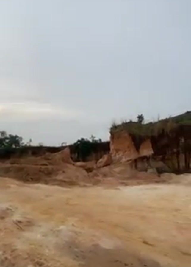 sandy, eroded landscape under a cloudy sky. The area appears to be a former quarry or excavation site, with high sandy cliffs and piles of loose earth. A person dressed in khaki-colored clothing is visible standing in the middle of the area, looking towards the camera. Some trees and vegetation are visible on the top of the cliffs. The video has a static camera angle.