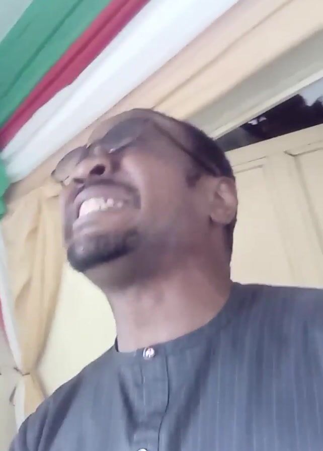 A man with dark skin and a goatee is looking upwards and singing. He wears sunglasses and a dark gray shirt with subtle pinstripes and a small emblem on the collar. The background includes a white wall, cream-colored curtains, and a green, white, and red decorative garland hanging from the ceiling. The camera is pointed upwards towards the man.