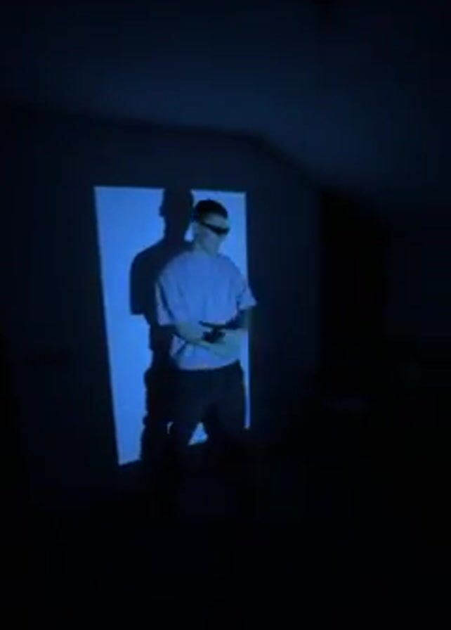 man in a blue-lit room dancing in front of a white screen. The lighting creates a stark shadow of him on the screen behind him. He is wearing a white t-shirt, dark pants, and sunglasses. He performs a variety of dance moves. The room is dark and appears to be a small, possibly attic, space. The music is loud and upbeat.