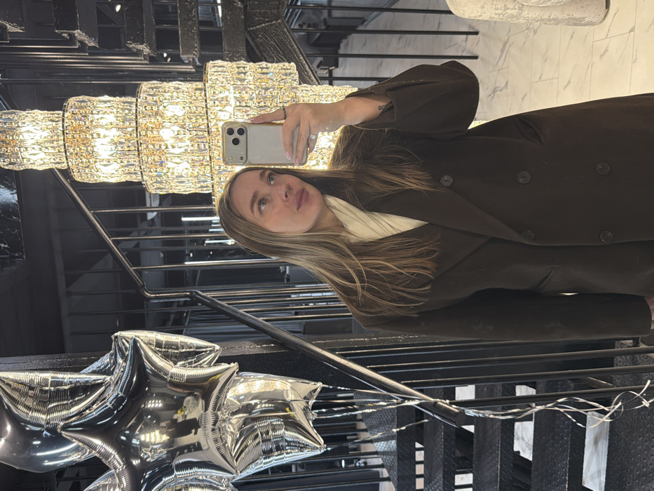The image depicts a young adult female taking a selfie within an upscale, multi-level indoor commercial or hospitality establishment in Moscow, Russia. The female, positioned centrally, has long, straight, light brown hair and is dressed in a dark brown double-breasted overcoat over a cream-colored top. She holds a light-colored smartphone (identified as an iPhone) with her left hand, angling it to capture her reflection, while looking slightly upward and to her right. A small tattoo is visible on her left forearm, and a ring is present on her left ring finger. To the left of the frame, a cluster of several silver, star-shaped foil balloons, tethered by thin ribbons, rises alongside a dark metal staircase featuring open risers and thin balusters. On the right, a prominent, multi-tiered crystal chandelier hangs, emitting warm light. The background includes further sections of the dark metal staircase and railings, suggesting a modern, industrial-chic design contrasting with the luxurious elements. The flooring appears to be a light-colored, polished marble or stone.
