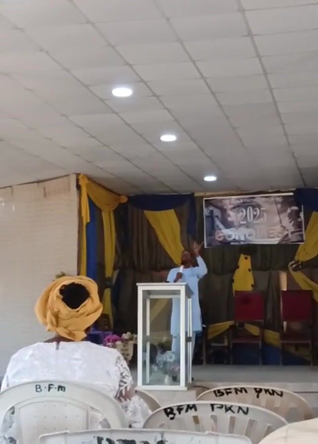 man speaking from a podium on a stage inside what looks like a church. He is wearing a light blue outfit. The stage backdrop is decorated with blue and yellow fabric, and a banner that reads "2025 Conquest." Several chairs are arranged in front of the stage, some with "BFM" or "BFM PKN" written on them. A woman in a white dress and a yellow headwrap is seated in the front row. The room has a drop ceiling with recessed lighting.