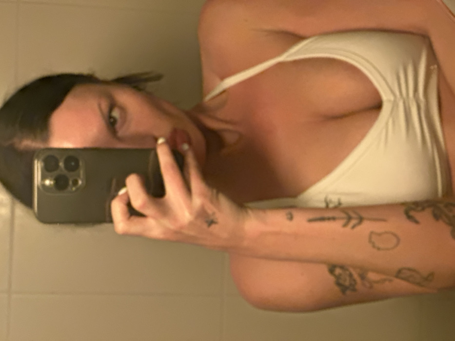 A woman takes a selfie. She holds a smartphone to capture her face, partially obscured by the device. She's wearing a white top, possibly a sports bra or swimsuit, revealing her chest. Her left arm is visible, adorned with several tattoos. The background appears to be a plain, tiled wall, suggesting a bathroom or similar space. The overall tone is casual and intimate.