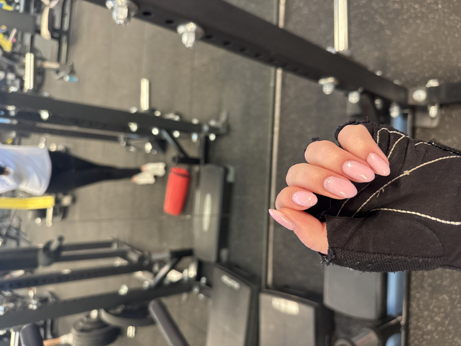 A close-up view displays a human hand, encased in a black fingerless weightlifting glove, with almond-shaped fingernails painted a light pink