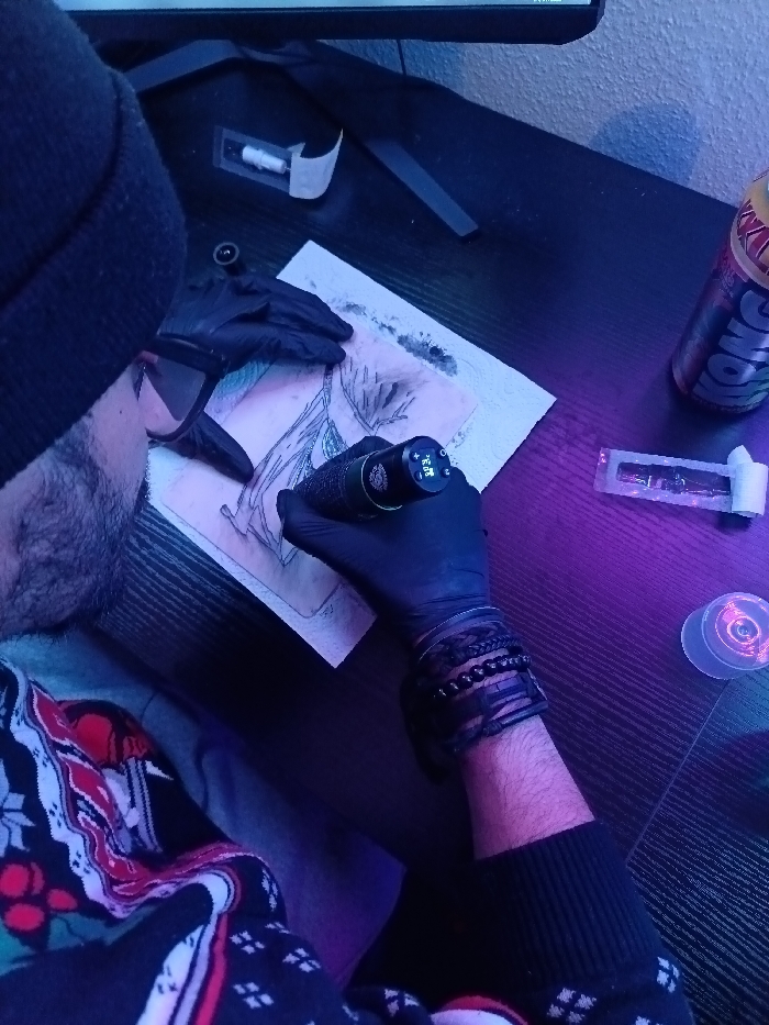 - "A tattoo artist wearing a black beanie, glasses, and black gloves is captured from above while working on a tattoo" by FM-Fezcd2, licensed under CC BY 4.0