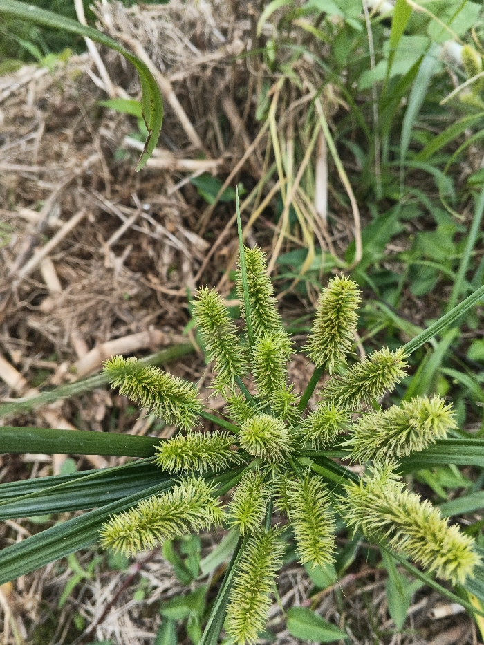 The image displays a close-up, top-down view of a plant's inflorescence, located in Khna, Cambodia. The central subject is a cluster of approximately fifteen light green, spiky, elongated seed heads, each measuring about 2-3 cm in length, arranged radially around a central stem. Several broad, flat, dark green leaves extend horizontally from the plant's base, partially obscured by the inflorescence. The background is out of focus, consisting of a textured ground cover dominated by dry, brown vegetative matter, including what appears to be fragments of dried stalks and grasses, intermingled with indistinct patches of green foliage. No human figures, animals, or man-made objects are present. No actions or interactions are depicted.