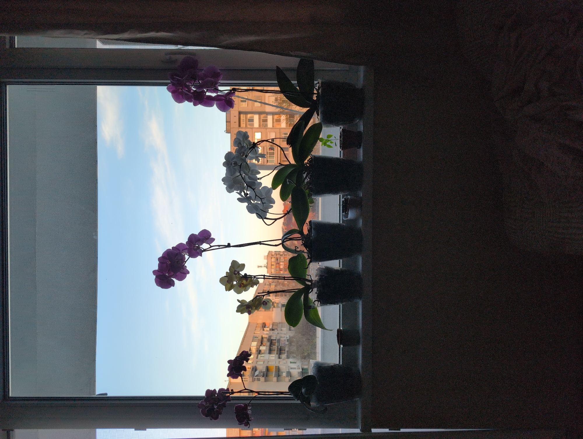 A dimly lit, indoor shot of a window in Plovdiv, Bulgaria, with several potted orchids lined up on the windowsill