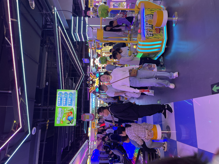 n arcade in Chongqing, China at the coordinates 29.645° N, 106.545° E. The arcade is brightly lit with neon lights. There are many people playing games. In the foreground, a woman in a white sweater and jeans is walking towards the camera. She is holding a brown leather purse on her shoulder. There is a yellow and blue game with a sign that says “Happy Fish” in Chinese characters. A young man in a striped shirt is playing the game, and a young woman in a purple shirt is standing next to him, watching. There are several other arcade games in the background, including a claw machine and a driving game. The arcade floor is checkered black and white. There are signs with pricing for games in Chinese characters. The arcade is crowded, and people are laughing and talking. There are also several adults standing around watching the children play. One man in a black shirt is walking towards the camera, watching his feet. A group of children stand at the back of the room watching the games. The arcade has a modern feel with brightly colored lights and graphics.