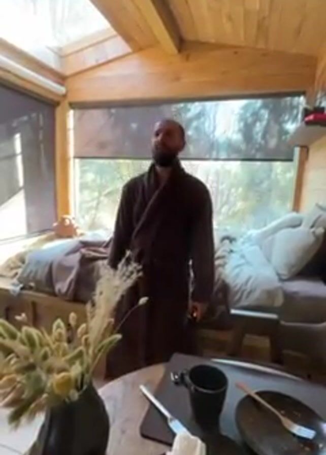 interior of a small, rustic-looking cabin. A man in a brown robe repeatedly steps onto and off a bed, with a determined look on his face. The bed, which seems to double as a seating area, is located near a large window that provides a view of trees. The room is brightly lit, with sunlight streaming in through the window and a skylight. In the foreground is a wooden table with a black vase containing some dried flowers, as well as dirty plates, cutlery, and a mug, suggesting a recent meal. The cabin's walls and ceiling are constructed of light-colored wood, giving the space a warm and cozy feel.