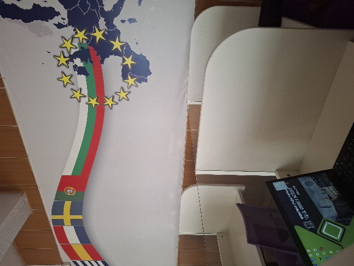 The image depicts an unoccupied interior space in Velingrad, Bulgaria, consistent with a study area or computer lab. A white wall dominates the background, featuring a large blue map of Europe on the right side. A wavy banner of national flags, displaying Greece, Spain, Sweden, Portugal, and Bulgaria from left to right, is affixed to this wall. A circular emblem of twelve yellow stars, representing the European Union, overlays the Bulgarian flag and part of the European map. Below the wall decorations, several light-colored individual study carrels with privacy panels are arranged. A single purple chair is partially visible within one of the carrels on the left. In the immediate foreground, an open black laptop computer rests on the desk surface of a carrel, its screen displaying a cityscape desktop background with green interface elements. A wooden trim borders the top of the wall, meeting a white ceiling. No individuals are present, and no actions or interactions are occurring.