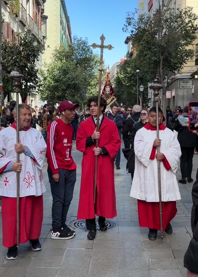 religious procession on a paved street lined with buildings in a city. The sky is bright blue. In the foreground, there are three people dressed in red and white religious attire. The person in the center is holding a tall, ornate cross. To their left, a person in a red athletic shirt stands. A person out of frame is holding a phone, presumably to take a photo or video. Behind them, a crowd of people of mixed ages and ethnicities fills the street. Some are dressed in regular street clothes, while others are in the same religious garb as the people in the foreground. A marching band is visible further down the street. The buildings are a mix of architectural styles and heights, and trees line the street between them. Overall, the scene appears to be a religious celebration or event taking place on a busy city street.