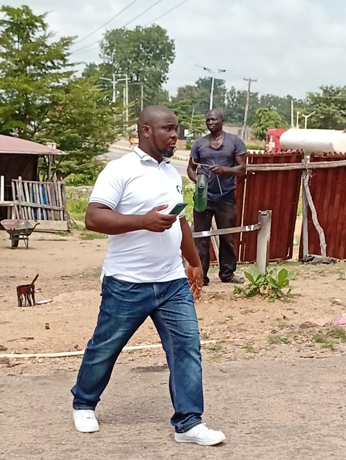The image depicts an outdoor scene in the city of Lokoja, Nigeria, under a cloudy sky. The ground is unpaved, consisting of dirt and sparse vegetation. In the foreground, slightly left of center, a bald adult male with a beard walks from right to left, his body angled towards the left, while his head is turned to the right. He wears a white polo shirt with a dark emblem on the left chest, blue denim jeans, and white sneakers. He holds a dark-colored smartphone in his right hand. To his left, a dark cylindrical object with a handle sits on the ground near a partially visible wheelbarrow. In the background, to the right, another bald adult male stands near a reddish-brown corrugated metal fence. He wears a dark blue t-shirt and dark trousers. He holds a green object, possibly a watering can or sprayer, in his left hand and a thin metal rod in his right hand. He is looking towards the foreground man. Behind the corrugated fence, a large white horizontal tank, consistent with a storage tank, is visible. Further in the background, a paved road or highway is visible, bordered by green trees, utility poles, and overhead power lines.