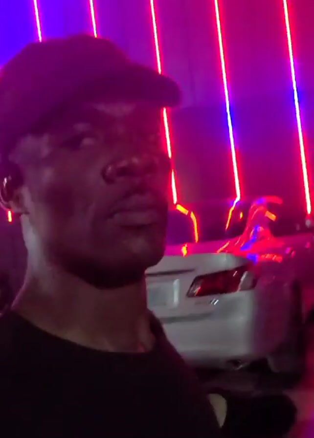 A man wearing a black shirt and a dark baseball cap looks at the camera. Behind him are cars, bright vertical red and blue lights, and a white air conditioning unit. The man is facing forward with a neutral expression. The cars seem to be parked in a garage or similar structure. The lighting gives the scene a neon-lit, urban feel.