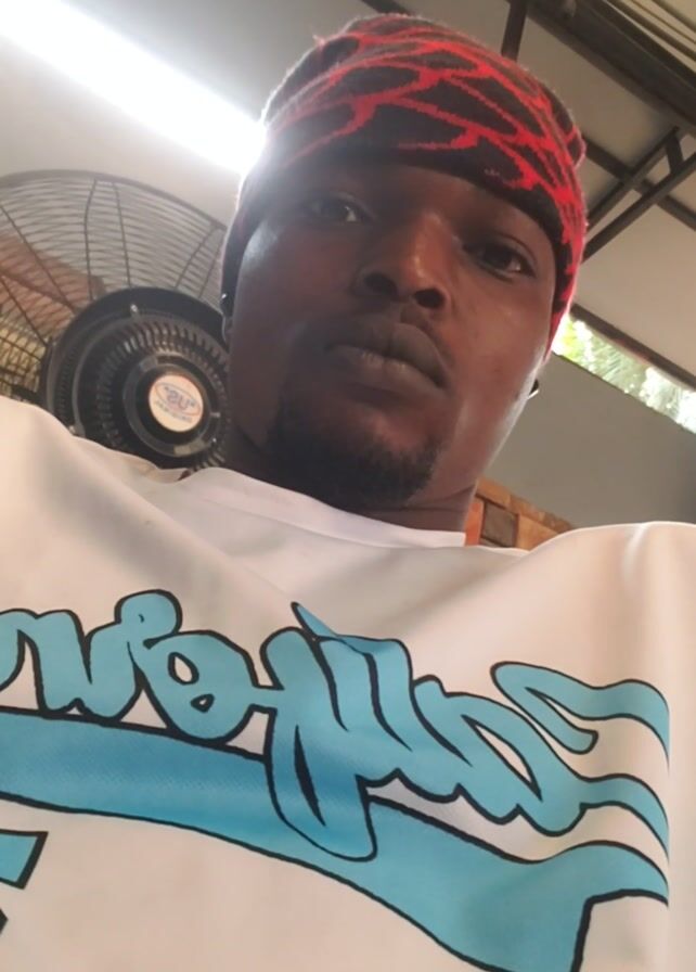 A man wearing a red and black knitted cap is looking down at the camera. He has dark skin and a short beard. He is wearing a white shirt with a large blue graphic on it. Behind him is a silver fan. The room appears to be an outdoor or semi-outdoor space with a metal roof and bright light coming through the openings. The camera pans up slightly to show the metal roof.