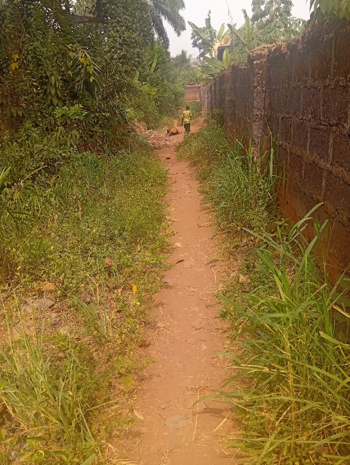 This image depicts a narrow, unpaved reddish-brown dirt path in Umuoji, Nigeria, extending into the background