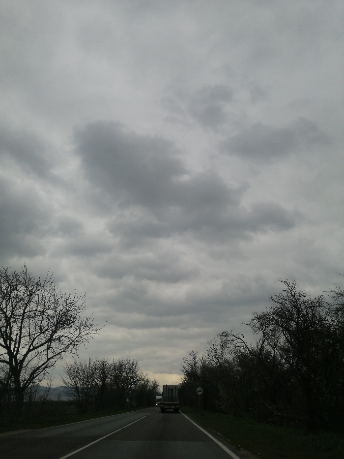 The image depicts a rural road segment within the Madzherito area of Bulgaria, observed from a vehicle traveling forward. The scene is dominated by a heavily overcast, gray sky, indicative of cloudy weather conditions. A two-lane asphalt road with a white solid fog line on the right and a dashed white center line extends into the distance, appearing to curve slightly right. In the mid-ground, a dark-colored truck with an open bed is visible, traveling in the same direction as the observer. Behind this truck, on the left side of the road, a lighter-colored vehicle is partially visible. Bare deciduous trees and dense, dark bushes line both sides of the road, consistent with late autumn, winter, or early spring foliage. A white circular road sign with a black border is positioned on the right shoulder of the road, featuring an indiscernible black graphic. Distant hills or mountains are faintly visible on the horizon line to the left. No individuals are present.