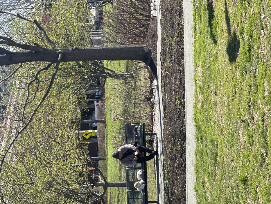 The image captures a sunny daytime scene in a park or green space located in the city of Washington, United States of America. A single individual is seated on a dark metal park bench, facing slightly right and downwards. The person is dressed in a light-colored jacket, dark pants, and a dark green knit cap, with a dark shoulder bag resting on their lap. They are holding a small, light-colored object in both hands. Three dogs are also on the bench. On the far left, a small, light-colored fluffy dog sits upright. Adjacent to it, a small white dog lies down. To the right of the seated person, a larger black and white husky-type dog is lying on its side. The foreground consists of green grass, a paved walkway with light gray tiles, and a strip of dark brown disturbed earth. The midground features the bench and subjects. In the background, multiple deciduous trees display nascent light green foliage, interspersed with bare bushes. A yellow diamond-shaped traffic sign with a black pedestrian symbol is visible in the distant background. Further back, urban buildings and vehicles are discernible, indicating proximity to a street or developed area. Shadows are present, consistent with direct sunlight.