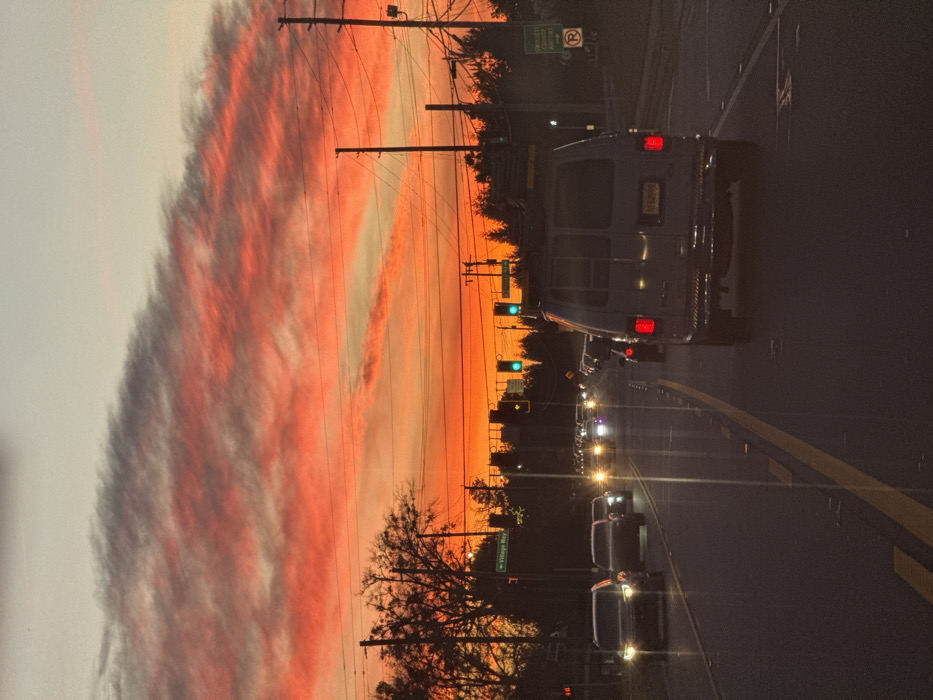 A street view at sunset with vibrant orange and red clouds in the sky. Cars line up at a traffic light, including a white van in the foreground. Power lines stretch across the sky. The scene is captured with a slight vertical rotation.