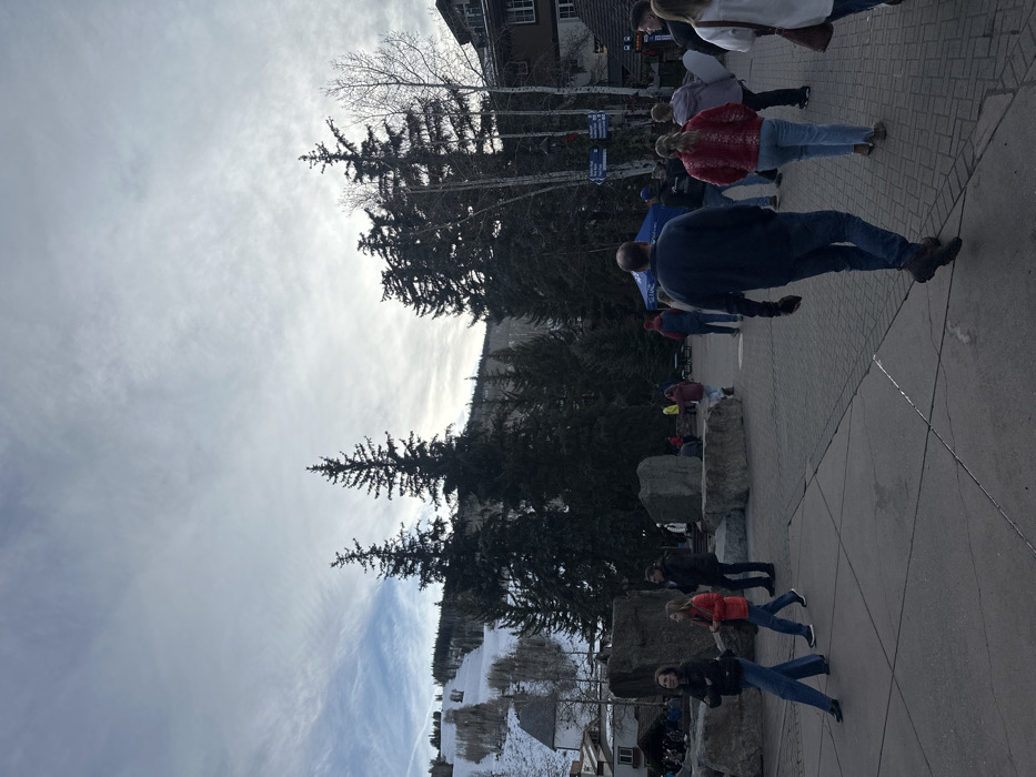 A daytime scene outdoors captures a group of people strolling along a paved walkway. Buildings and snow-covered slopes are visible in the background. Towering evergreen trees frame the landscape, reaching toward a cloudy sky. The composition is vertically oriented.