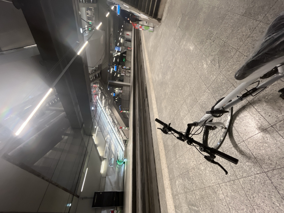 An elevated view shows a bicycle parked on a tiled platform, its handlebars and part of the frame visible. The platform borders a train track below. Overhead, there is an escalator and structural architecture with integrated lighting. A display board and signage are also visible. The scene is a public transportation hub, likely a subway or train station.