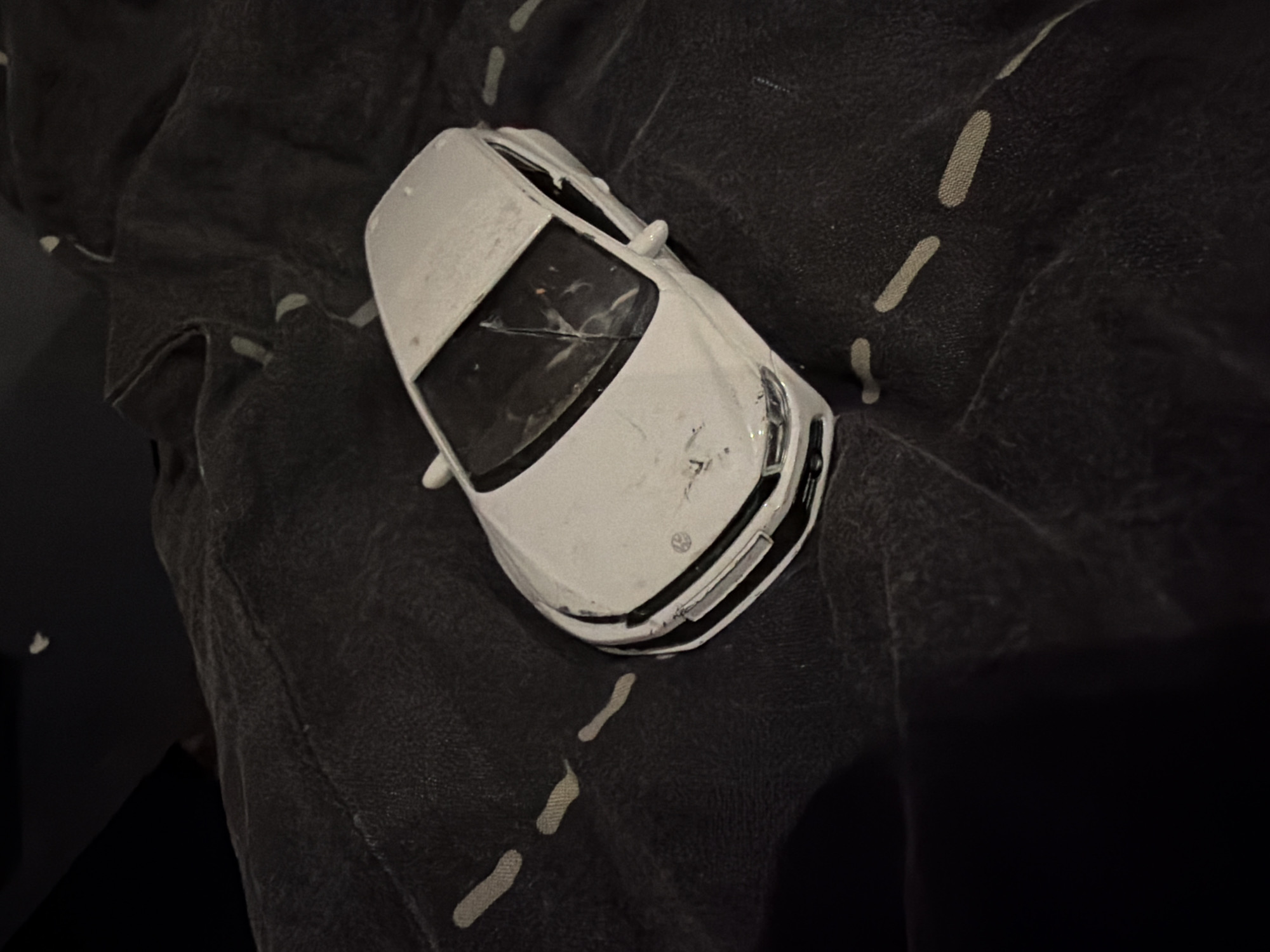 A white toy car with a cracked windshield sits on a dark fabric with dashed markings, resembling a stylized road