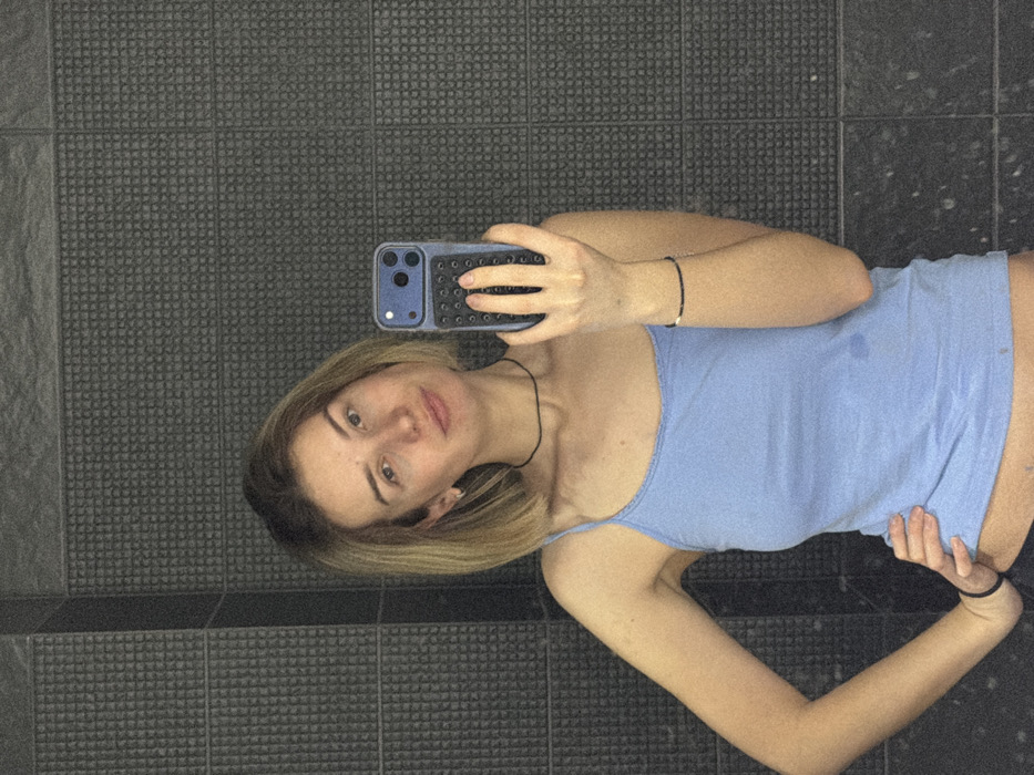 A female subject is depicted in a self-portrait, captured via a mirror reflection. She has light skin, shoulder-length blonde hair, and a light complexion with visible freckles. She is wearing a light blue spaghetti strap tank top, a thin black choker necklace, and two thin bracelets on her right wrist: one black and one with a gold-colored bead. Her right hand holds a dark blue/grey cased smartphone, featuring a triple-camera system, directed towards the mirror to capture the image. Her left hand is placed on her hip. The subject faces forward with a slight smile. The background is a dark grey tiled wall with a uniform, small-square textured pattern. The scene is located in the city of Chaikovsky, Russia.