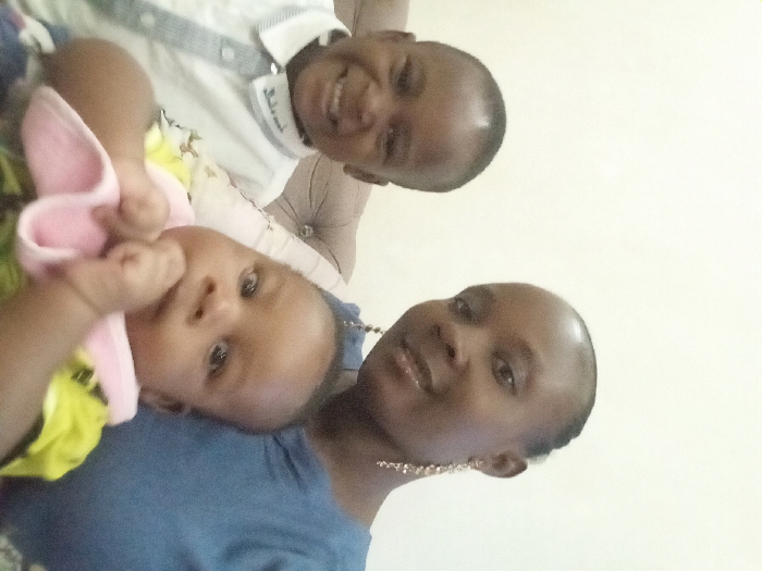 This image depicts three individuals in an indoor setting in Barden Yana, Nigeria. An adult female, positioned in the upper right, has dark skin, short dark hair, and wears a blue garment and long, light-colored dangling earrings. She looks towards the camera with a slight smile. To her left and slightly below is a young boy with dark skin, short dark hair, wearing a white collared shirt with blue accents and an inscription. He smiles broadly, showing teeth, and looks towards the camera. In the foreground, below the adult female, is an infant with dark skin, wearing a yellow top and a pink bib. The infant has fingers near its mouth and looks directly towards the camera with wide eyes. A light-colored upholstered furniture piece is visible behind the young boy, and the background consists of a plain, light-colored wall.