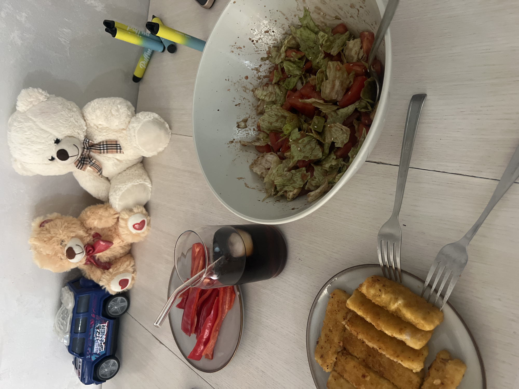 tabletop scene with various objects. A large bowl of salad containing lettuce and tomatoes sits at the top center. To the lower right, a plate of fried food, possibly mozzarella sticks, is present along with two forks. A glass of dark liquid, likely red wine, is positioned next to a plate containing sliced red peppers. Beside these plates, a toy car and two teddy bears are visible. Two vaping pens are next to one of the teddy bears. The image appears to be taken indoors, with the tabletop surface visible. There's no information to indicate that the scene is located in Budva, Montenegro. No people are visible.