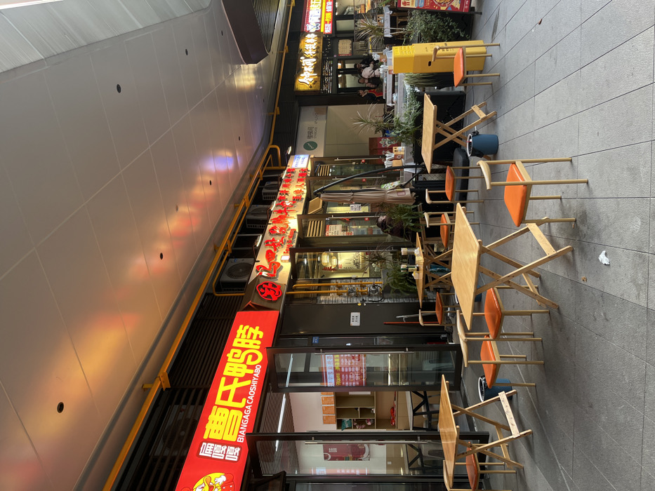 The image depicts an outdoor dining area adjacent to a row of commercial storefronts in Wenjiang District, China