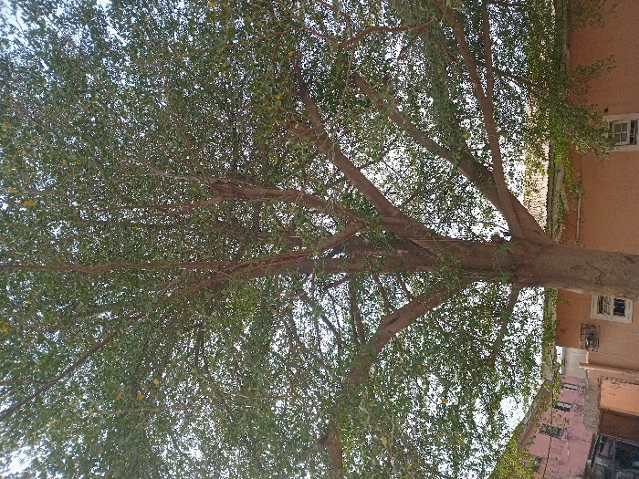 A tree with lush green leaves dominates the view. Its thick trunk and branches stretch across the frame, contrasting against a light sky. A building with light orange walls and white-framed windows is visible to the right of the tree trunk. The foliage is dense, creating a canopy effect. The image is taken from a low angle, looking up into the tree.