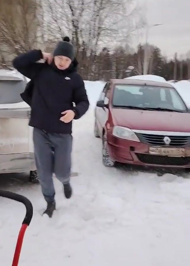 A man walks in the snow towards the camera, carrying a black bag on his shoulder. He stops and adjusts the bag. A young child, wearing a green and blue winter outfit and a gray hat, sits on a red and blue child's sled. The man stands behind the child. Two cars are parked on either side of them. The ground is covered in snow, and there are trees and a building visible in the background.