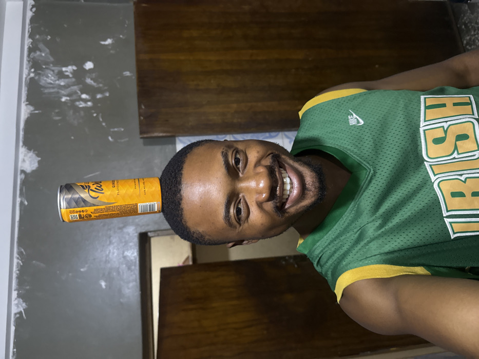 A man wearing a green and yellow “IRISH” jersey balances a yellow Twisted Tea can on his head. He is smiling broadly, revealing his teeth. The background includes a dark wood-paneled area, a gray wall with white marks, and a partially visible doorway behind the man. The image is slightly rotated.